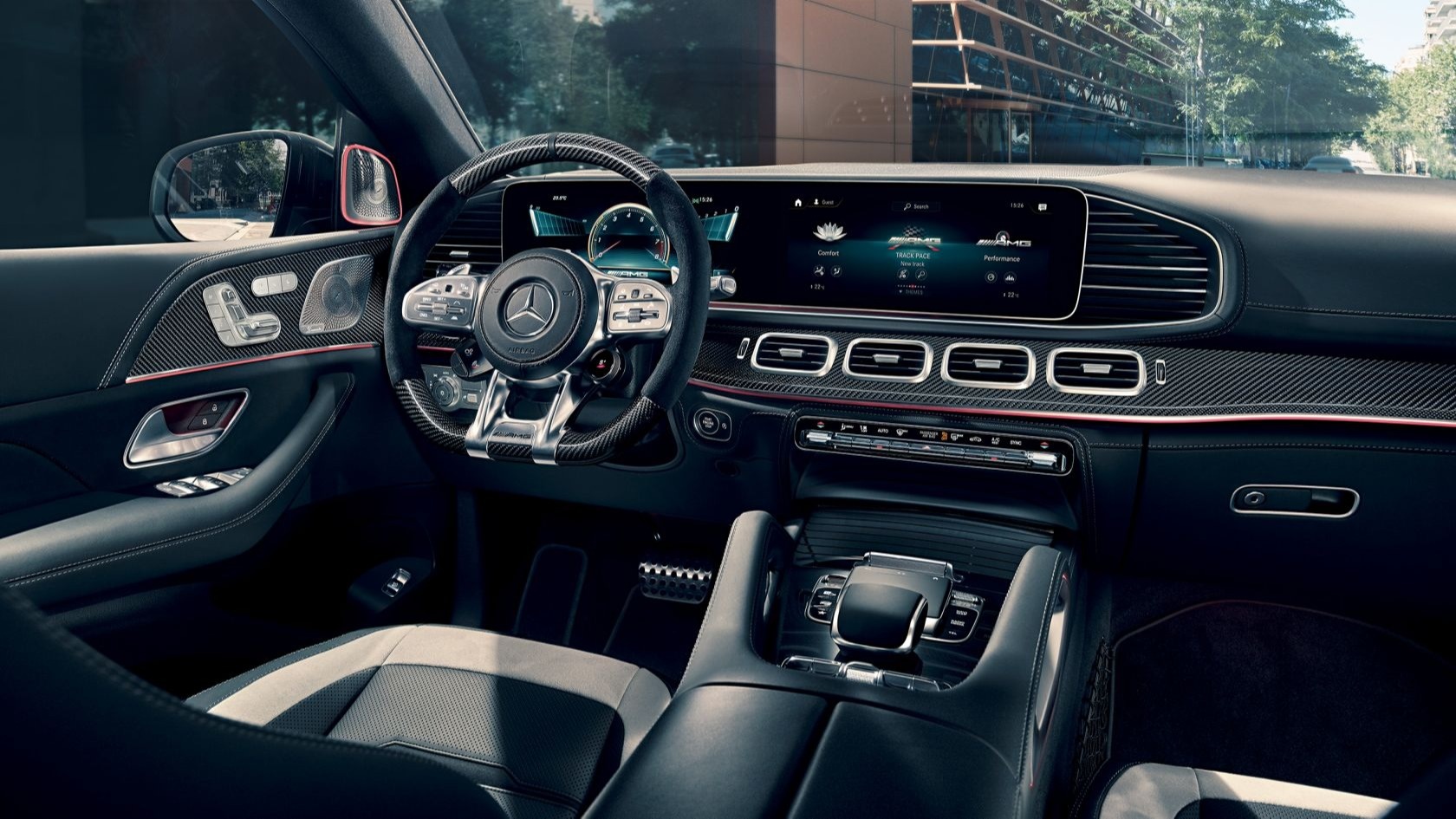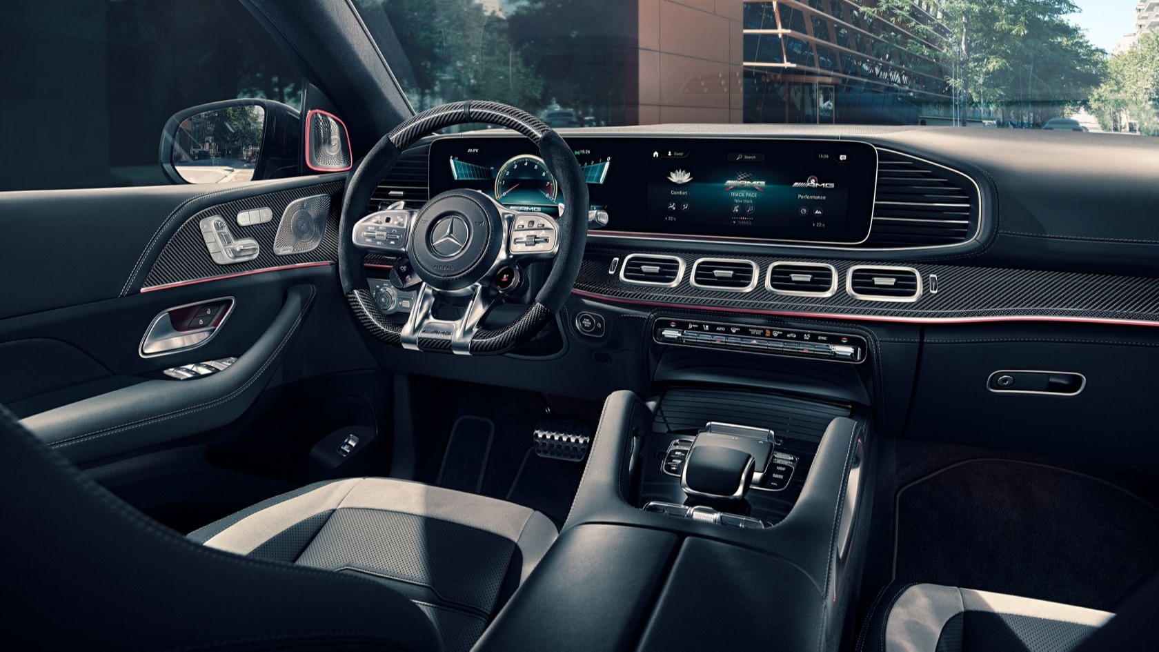 Салон нового купе Mercedes-AMG GLE S 63 4MATIC+ идеально соответствует стилю мощного спортивного автомобиля. Характерные для AMG элементы комплектации усиливают ощущение динамики и добавляют салону комфорта.