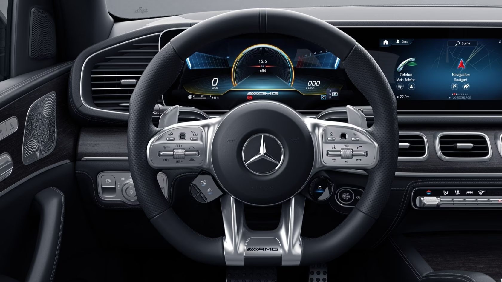 Рулевое колесо с притягивающей внимание надписью AMG и отделкой из кожи наппа обладает оптимальной эргономикой для динамичного выполнения маневров.