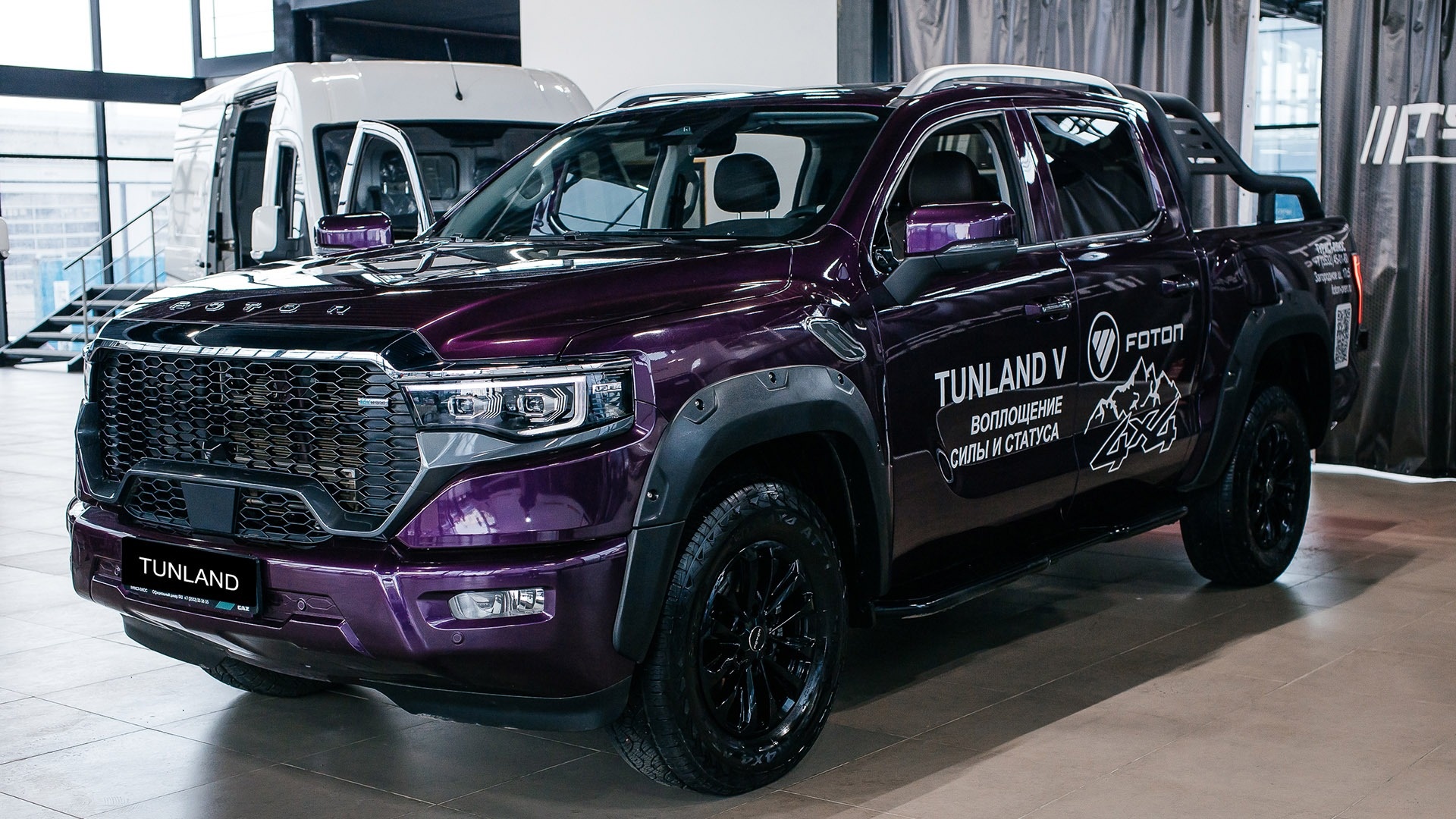 Высокую оценку со стороны специалистов получила премиальная модель FOTON TUNLAND V9 — полноразмерный пикап со стильным дизайном и расширенным набором систем безопасности. Габариты модели — 5617 × 2090 × 1955 мм, колесная база — 3355 мм, дорожный просвет — 240 мм. Максимальная разрешенная масса составляет 3055 кг, грузоподъемность — 675 кг. Размер грузовой платформы — 1577 × 1650 × 530 мм. Автомобиль оснащен 2-литровым турбодизельным двигателем экологического класса «Евро-5» мощностью 159 л.с., с крутящим моментом 410+60 Н•м в диапазоне 1500–2400 об/мин, работающим в паре с 8-ступенчатой автоматической коробкой передач. В состав силовой установки входит 48-вольтовая гибридная система, добавляющая 60 Н•м, а при пиковых нагрузках — более 80 Н•м, что повышает топливную экономичность и динамику, особенно при разгоне и движении в гору. Система рекуперации энергии снижает расход топлива на 5–8%.